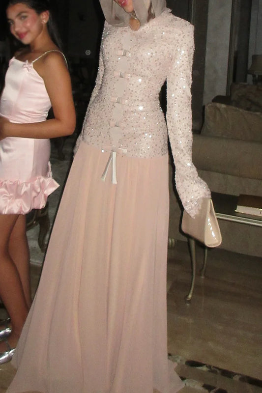 Gold Beaded Long Sleeves Scoop Evening Dress