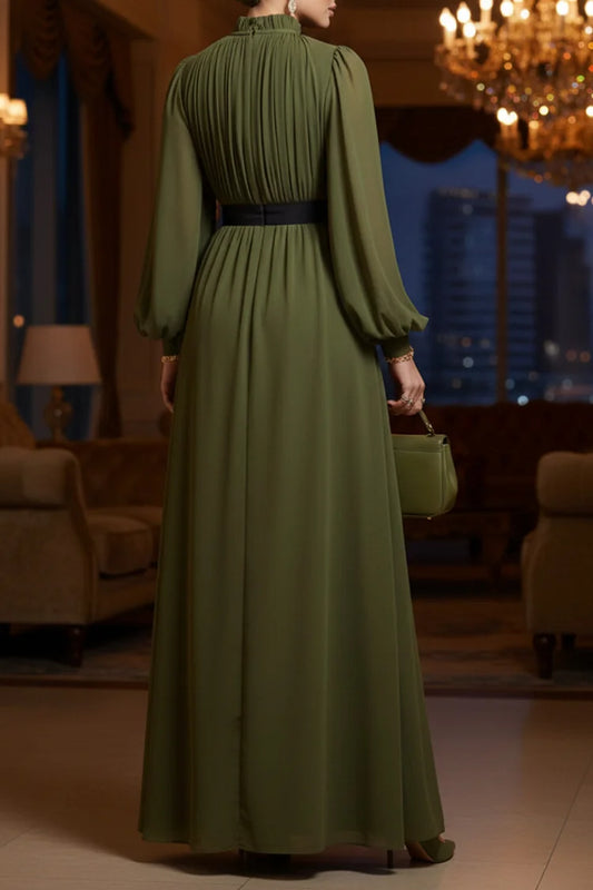 Pleated Mock Neck Puff Sleeve Solid Color Party Maxi Dress