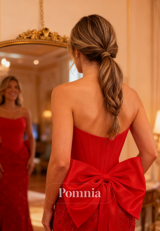 Red Sleeveless Strapless Bowknot Slit Prom Dress