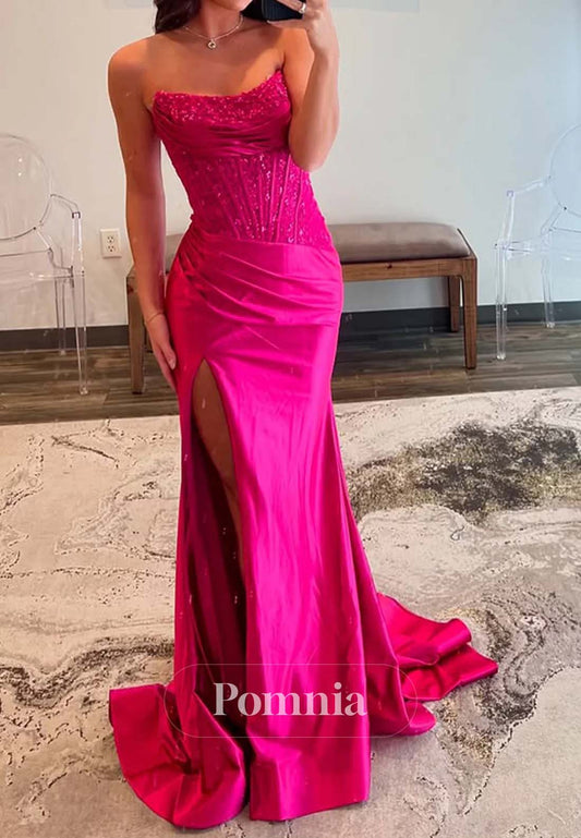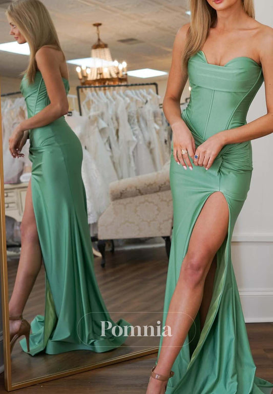 Sheath Strapless Sleeveless Prom Dress with Slit Corset Ruched Evening Party Dress