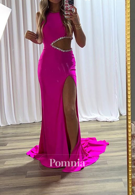 High Neck Halter sleeveless Prom Dress with Slit Ruched Evening Party Dress