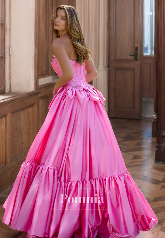 Candy Pink Strapless Sleeveless Prom Dress with Bowknot Ruched Evening Party Dress