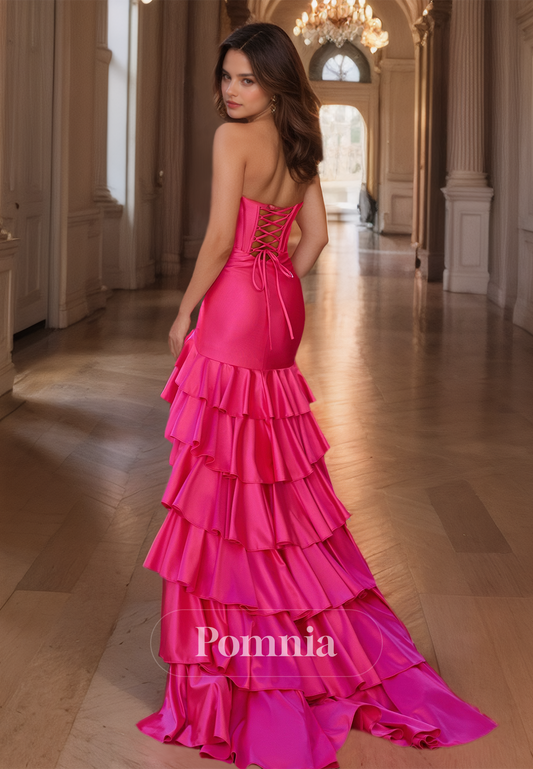 Fuchsia Strapless Sleeveless Prom Dress with Slit Ruffles Evening Party Dress