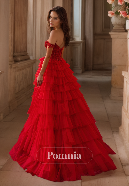 Red A-Line Off-Shoulder Illsuion Corset Prom Dress with Slit Ruffles Evening Party Dress