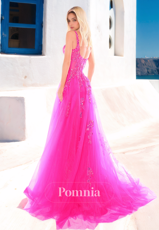 A-Line Spaghetti Straps Off-Shoulder Prom Dress with Slit Corset Tulle Evening Party Dress