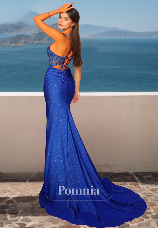 Sparkly Spaghetti Straps V-Neck Prom Dress with Train Lace-Up Back Evening Dresds