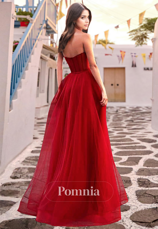 Red A-Line Strapless Sleeveless Prom Dress with Slit Empire-Waist Evening Party Dress