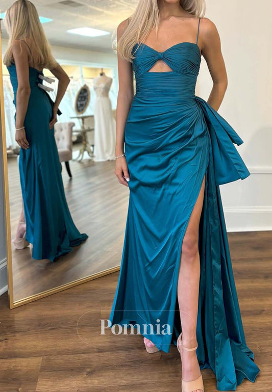 Sheath Spaghetti Straps Scoop Prom Dress with Slit Ruched Evening Party Dress