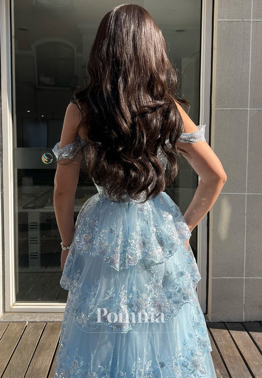 Off-Shoulder A-Line Empire-Waist Tiered Sequins Appliques Prom Dress