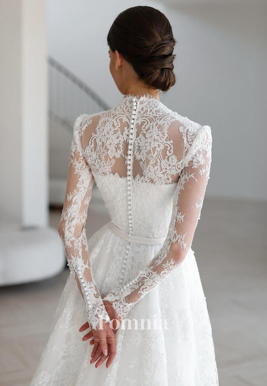 A-Line Long Sleeves High Neck Corset Lace Wedding Dress