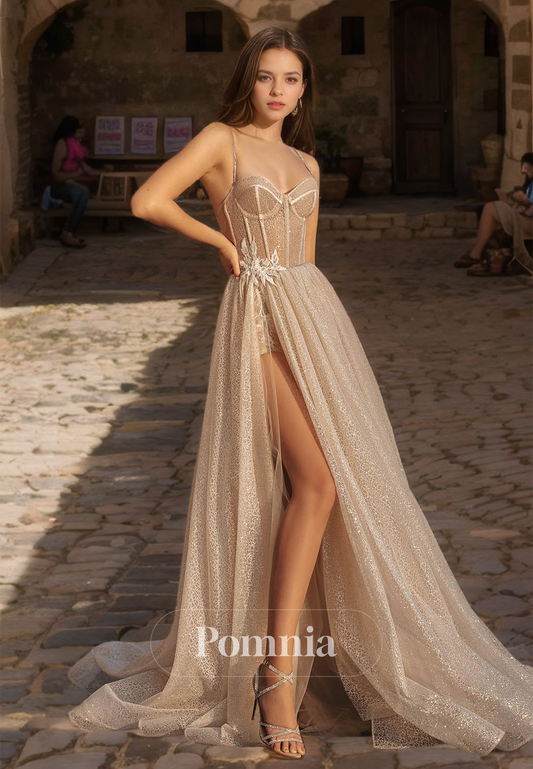 Charming Spaghetti Straps Corset Tulle Slit Illusion A-Line Wedding Dress