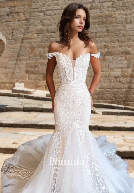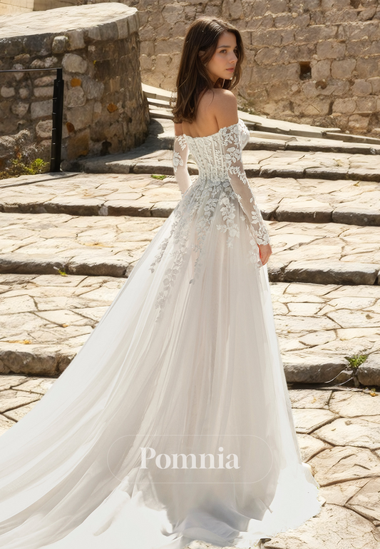 Off-Shoulder Long Sleeves Court Train Appliques Lace Wedding Dress
