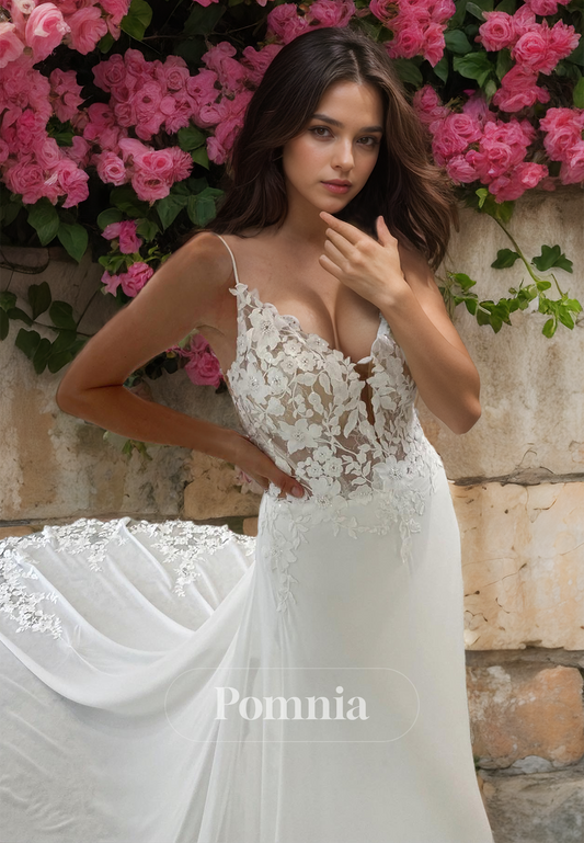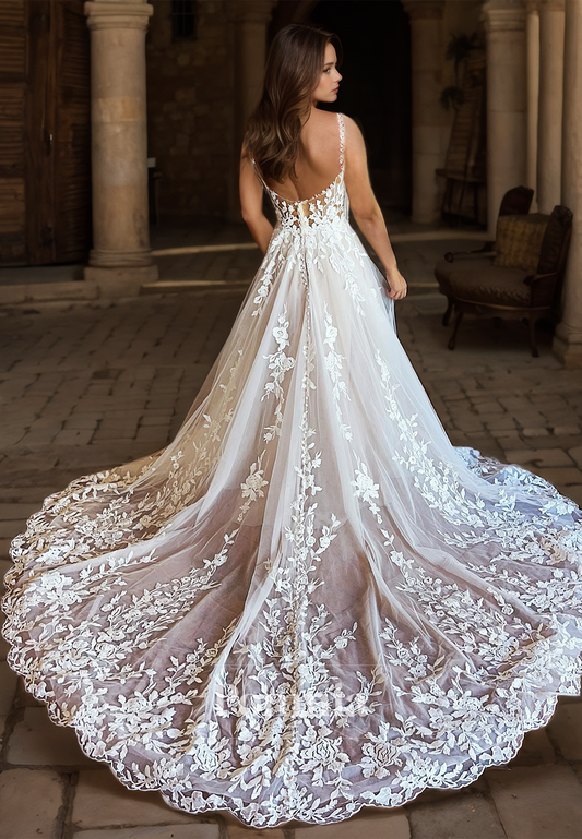 Chic A-Line Spaghetti Straps V-Neck Court Train Side Slit Lace Wedding Dress