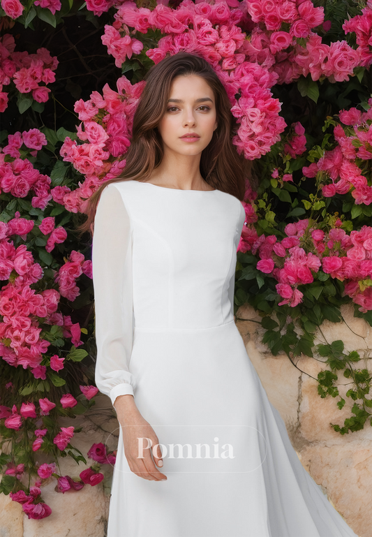 Elegant A-Line Scoop Sweep Train Satin Wedding Dress with Sleeves