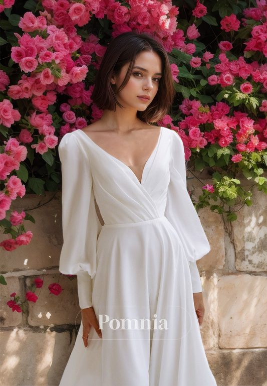 Elegant A-Line Long Sleeves V-Neck Sweep Train Backless Satin Wedding Dress