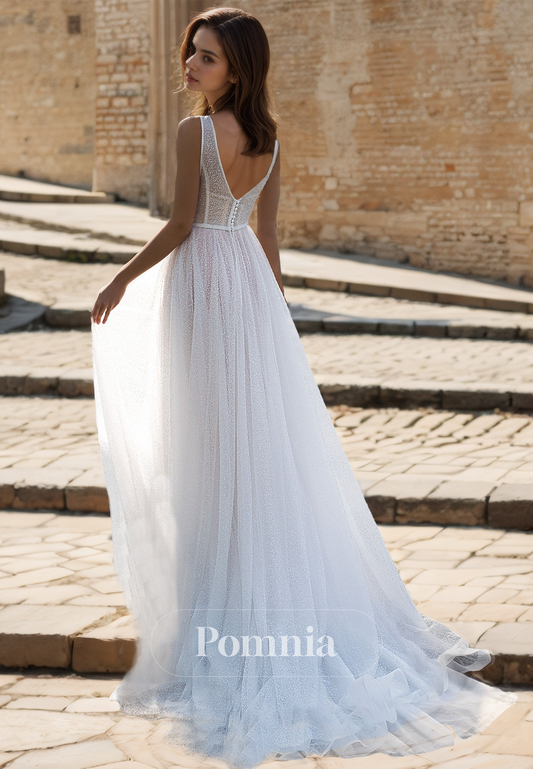 Deep V-Neck A-Line Side Slit Backless Illusion Corset Boho Wedding Dress