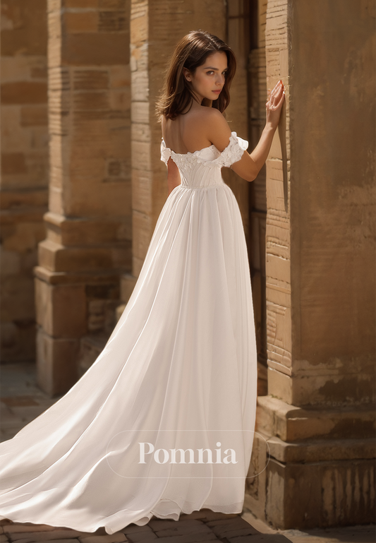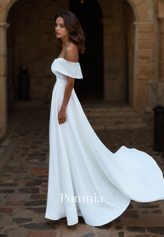 Elegant A-Line Off-Shoulder Side Slit Court Train Satin Wedding Dress