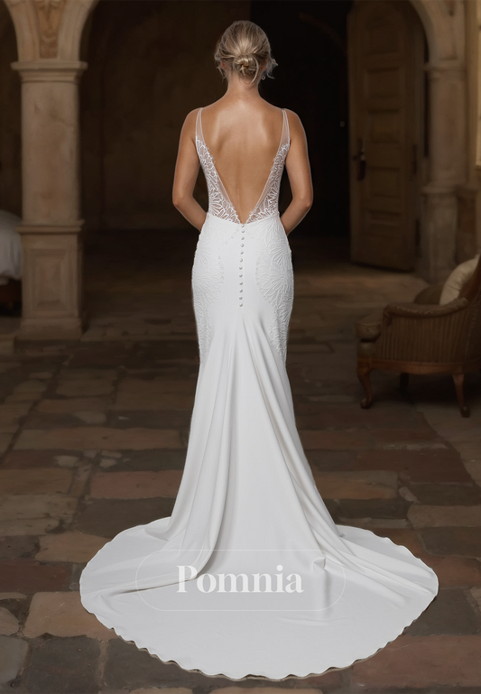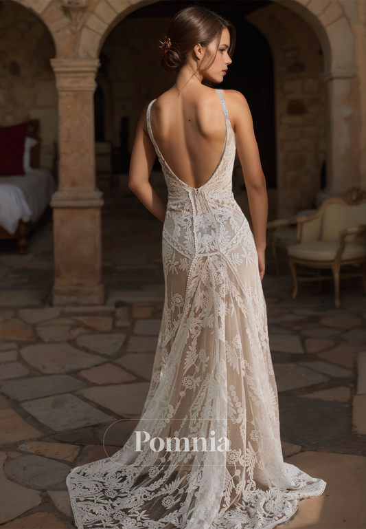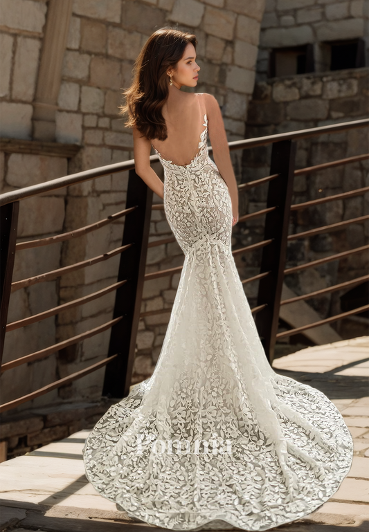 Ornate Spaghetti Straps V-Neck Backless Mermaid Lace Wedding Dress