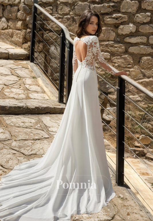 A-Line Long Sleeves Scoop Empire-Waist Sweep Train Lace Wedding Dress
