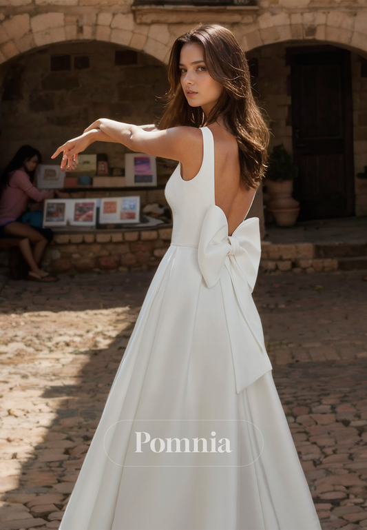 Simple A-Line Spaghetti Straps Square Side Slit Bowknot Satin Wedding Dress