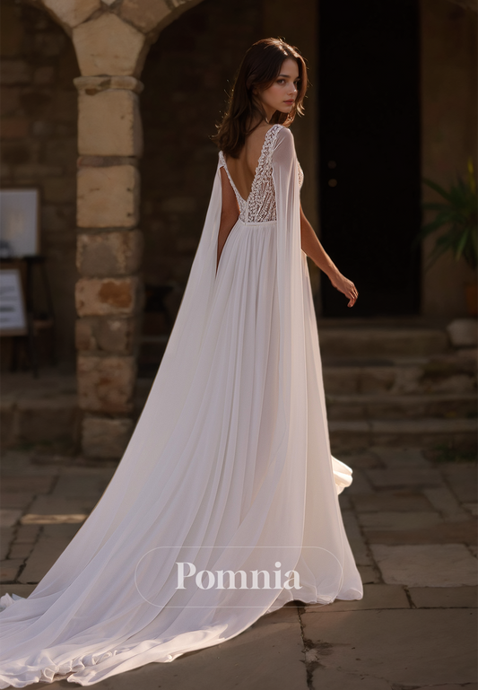 Lace Long Sleeves V-Neck Corset Tulle Court Train Beach Wedding Dress