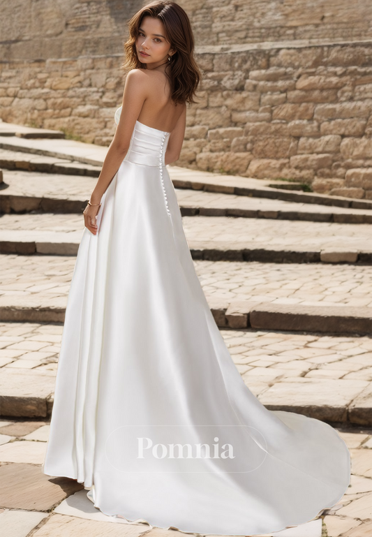 Simple A-Line Sleeveless Strapless Ruched Side Slit Satin Wedding Dress