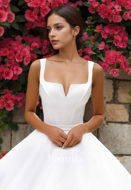 Spaghetti Straps Square Empire-Waist Corset Tulle Court Train Satin Wedding Dress