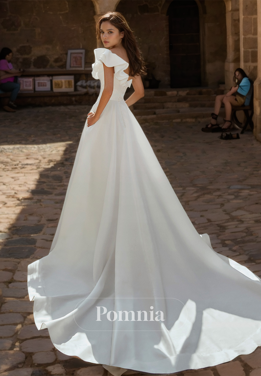 Simple One Shoulder A-Line Sleeveless Court Train Satin Wedding Dress