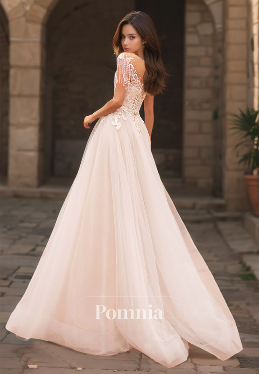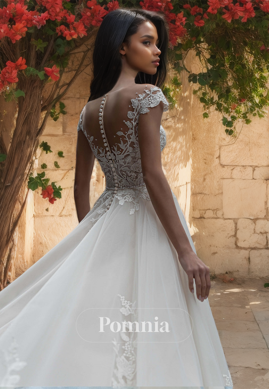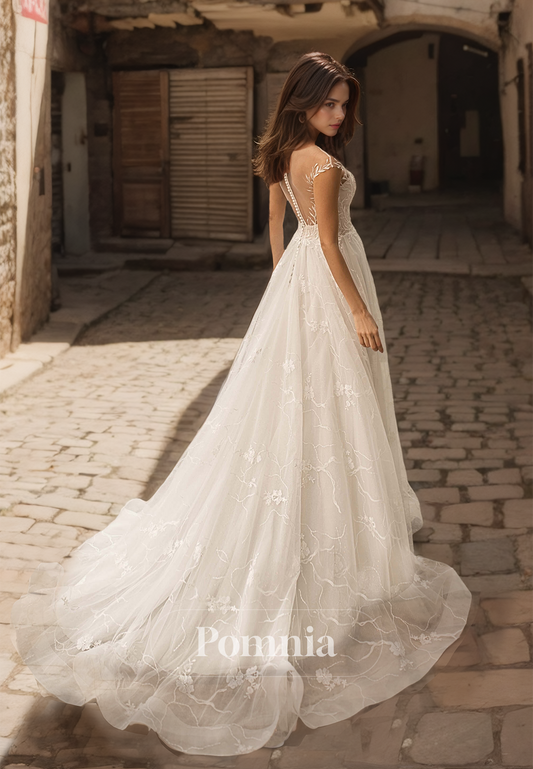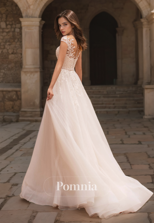 A-Line Scoop Cap Sleeves Illusion Court Train Corset Tulle Lace Wedding Dress