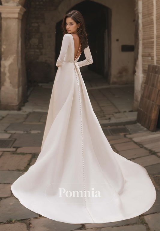 Chic A-Line Long Sleeves Illusion V-Neck Empire-Waist Corset Satin Wedding Dress