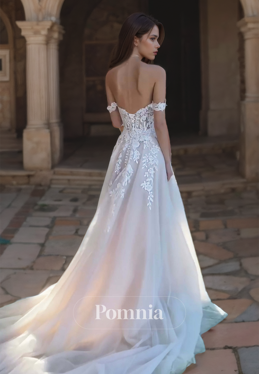 A-Line Off-Shoulder Backless Side Slit Court Train Floral Appliques Lace Wedding Dress