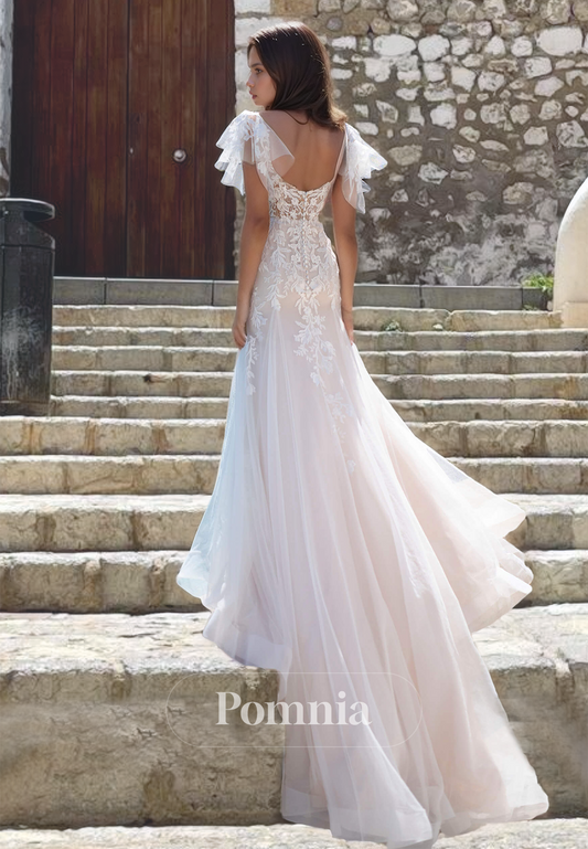 Charming A-Line V-Neck Cap Sleeves Corset Tulle Appliques Lace Wedding Dress