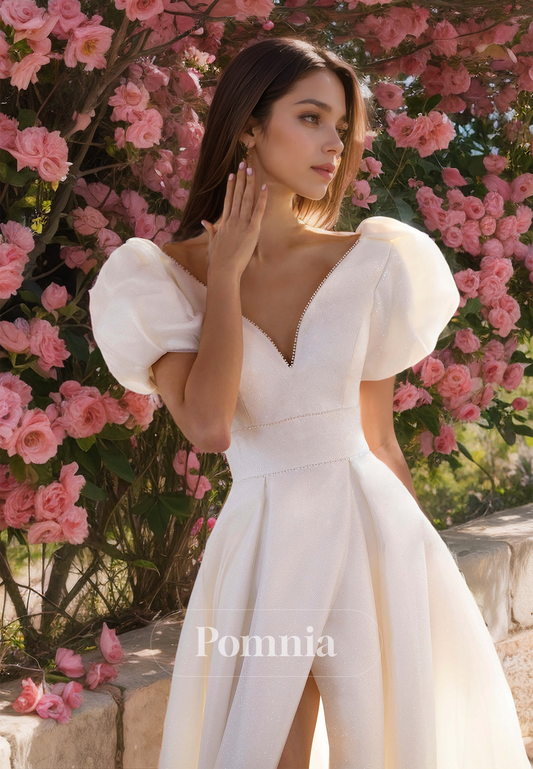 A-LIne Puff Sleeves V-Neck Side Slit Sweep Train Backless Satin Wedding Dress