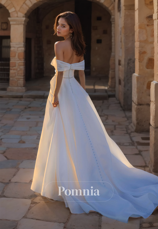 Simple Off-Shouder Strapless Sleeveless Court Train Beads Satin Wedding Dress