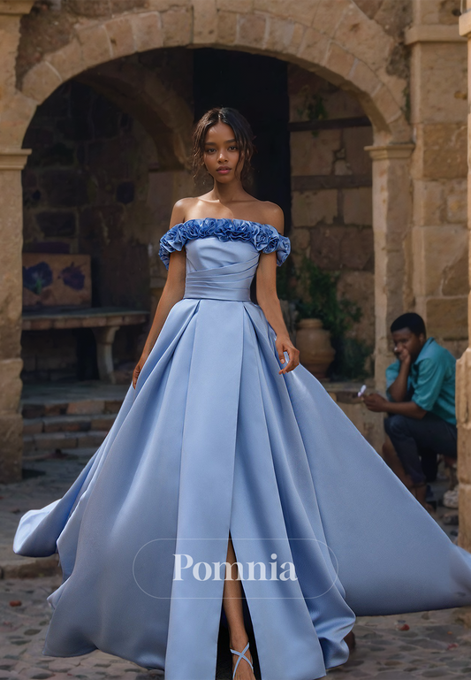 A-Line Off-Shoulder Slit Court Train Empire Waist Backless Satin Wedding Guest Dress