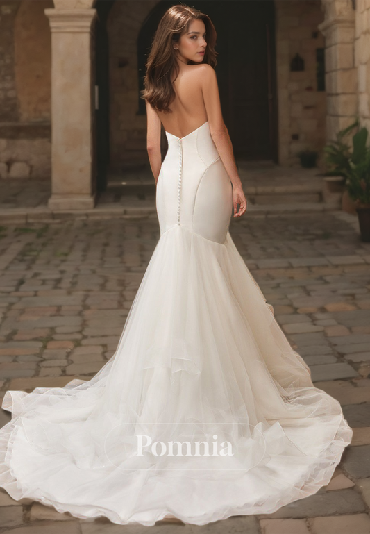 Elegant Strapless Sleeveless Ruched Side Slit Empire-Waist Satin Mermaid Wedding Dress