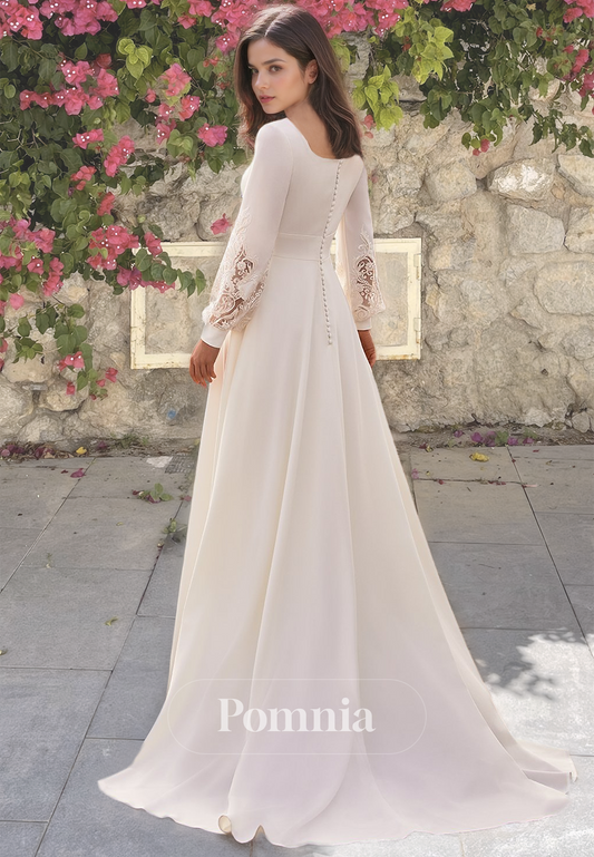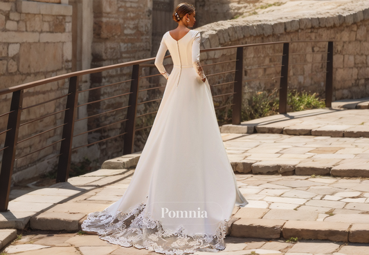 Elegant A-Line Long Sleeves Scoop Sweep Train Corset Satin Wedding Dress
