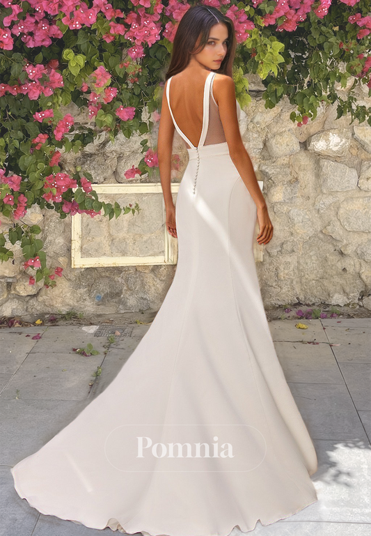 Simple A-Line Spaghetti Straps V-Neck Illusion Backless Court Train Satin Wedding Dress