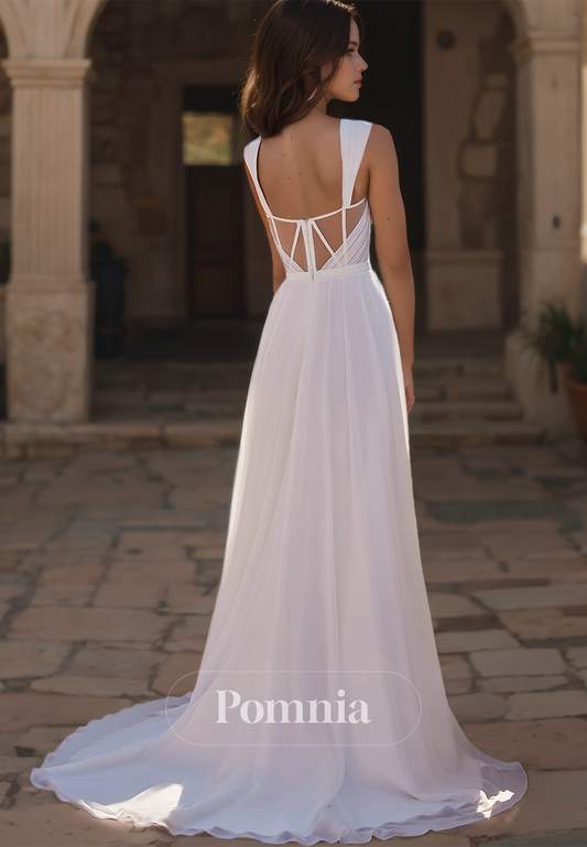 A-Line Off-Shoulder Sleeveless Side Slit Ruched Sweep Train Beach Wedding Dress