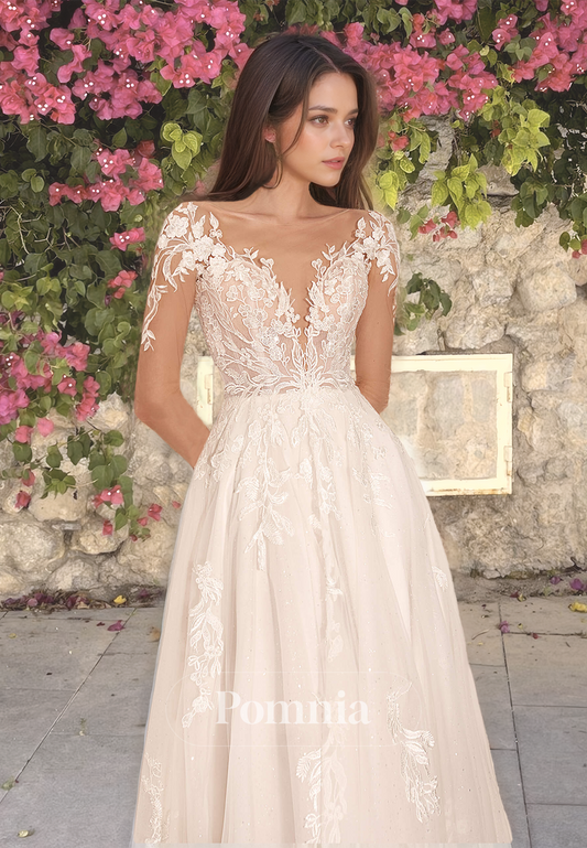 A-Line V-Neck Long Sleeves Illusion Appliques Corset Tulle Floor-Length Lace Wedding Dress