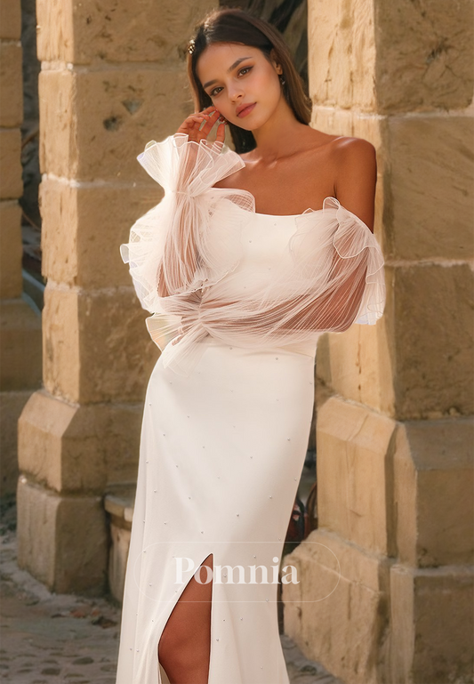 Charming A-Line Off-Shoulder Puff Sleeves Backless Side Slit Romantic Wedding Dress