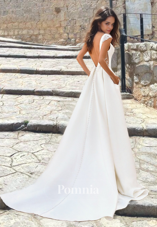 Elegant A-Line V-Neck Cap Sleeveless Corset Sweep Train Satin Wedding Dress