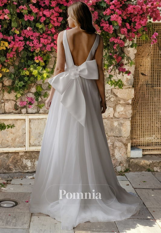 A-Line V-Neck Long Sleeveless Empire-Waist High Slit Beach Wedding Dress