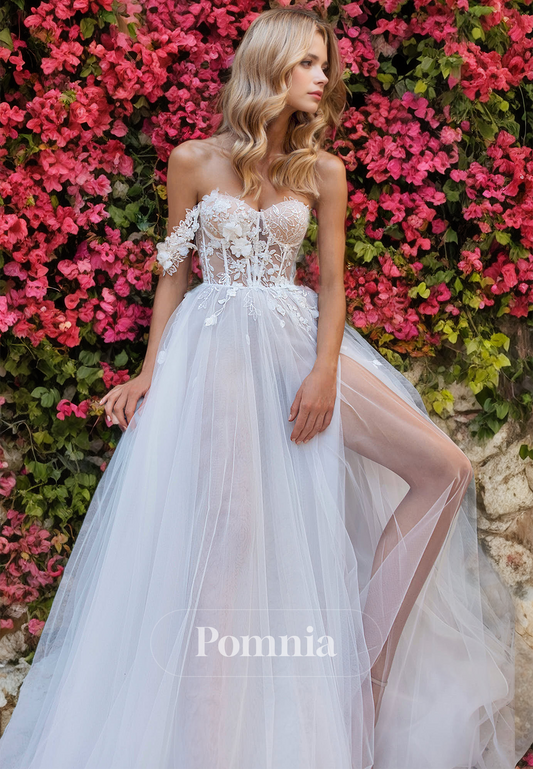 A-Line Off-Shoulder Sweetheart Appliques Side Slit Empire-Waist Long Boho Wedding Dress