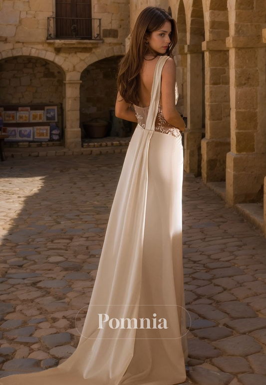 A-Line Straps V-Neck Appliques Sleeveless High Slit Long Bohemian Wedding Dress