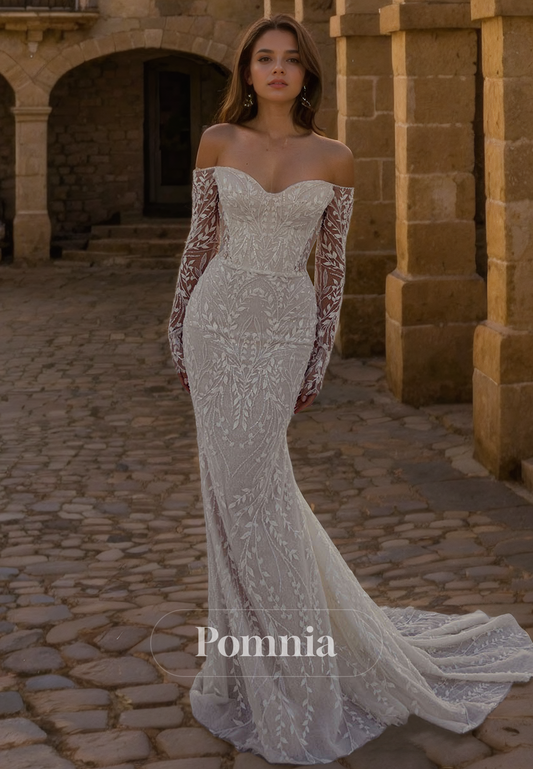 Off-Shoulder Long Sleeves Mermaid/Trumpet Lace Appliques Bohemian Wedding Dress