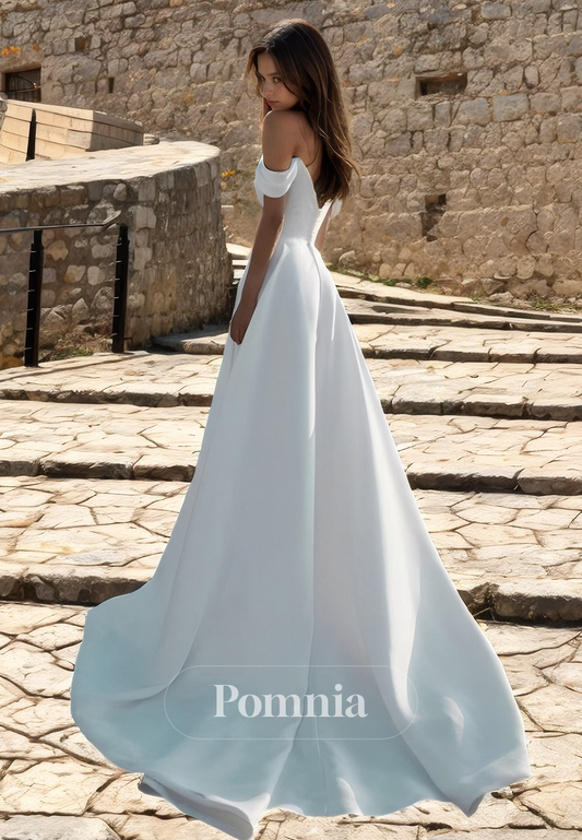 A-Line Off-Shoulder Scoop Side Slit Satin Long Beach Wedding Dress