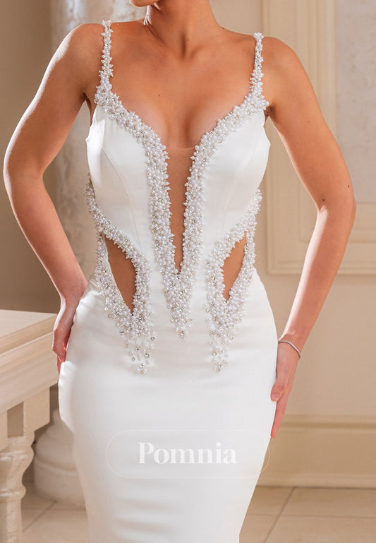 Spaghetti Straps V-Neck Pearls Mermaid Wedding Dress