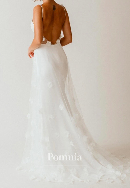 Spaghetti Straps V-Neck Appliques Backless Wedding Dress