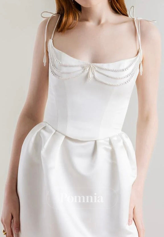 Spaghetti Straps Scoop Pearls Mini Wedding Dress
